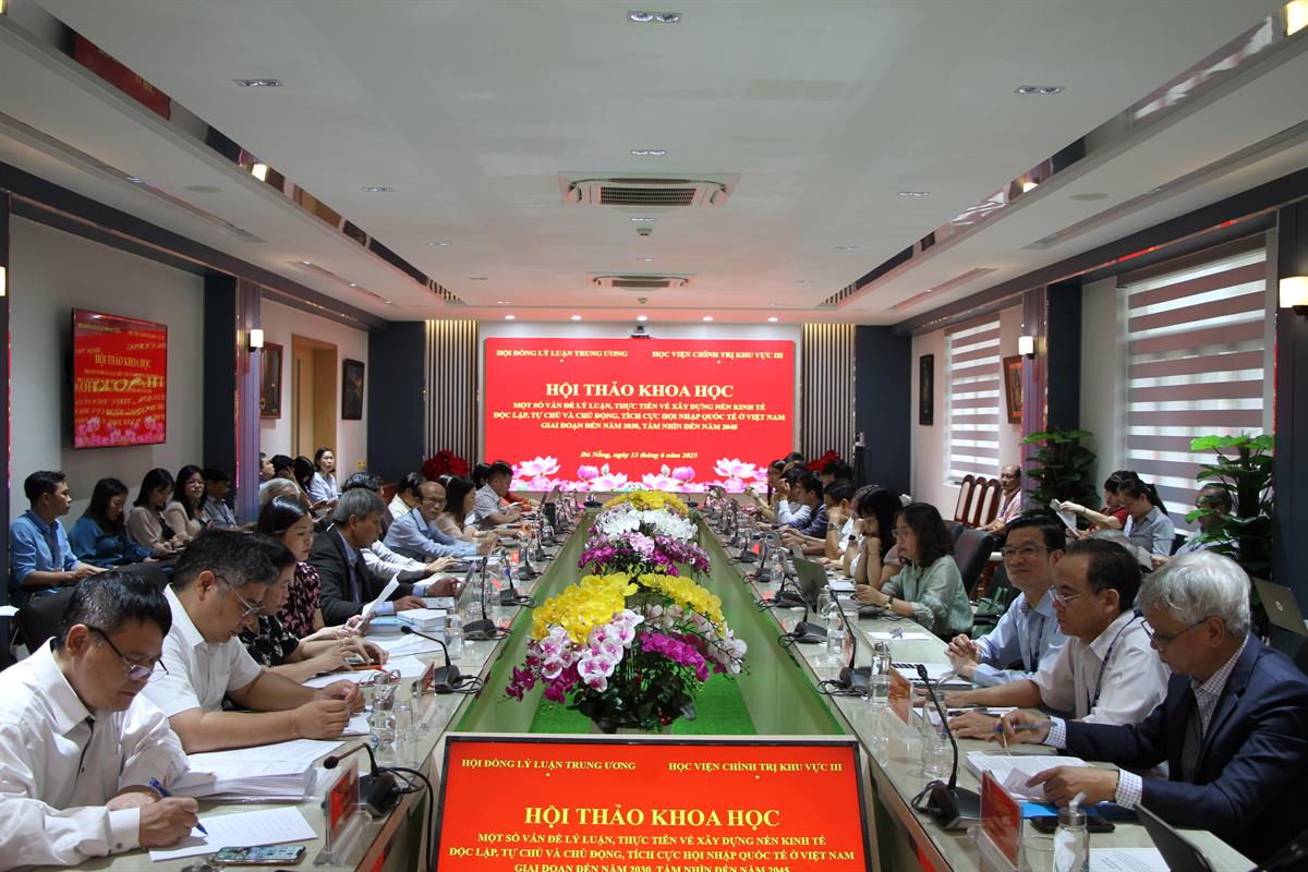 Tham dự Hội thảo có GS,TS Tạ Ngọc Tấn, nguyên Ủy viên Ban Chấp hành Trung ương Đảng, Phó Chủ tịch Thường trực Hội đồng Lý luận Trung ương; GS,TS Nguyễn Quang Thuấn, nguyên Chủ tịch Viện Hàn lâm Khoa học xã hội Việt Nam, Trưởng Tiểu ban Kinh tế Hội đồng Lý luận Trung ương; các nhà khoa học của Hội đồng Lý luận Trung ương, các viện nghiên cứu, các trường đại học trên địa bàn thành phố Đà Nẵng và khu vực miền Trung. Về phía Học viện Chính trị khu vực III có PGS,TS Đoàn Triệu Long - Giám đốc Học viện, Ủy viên Hội đồng Lý luận Trung ương; các Phó Giám đốc Học viện: PGS,TS Nguyễn Ngọc Hòa, PGS,TS Lê Văn Đính và PGS,TS Phạm Đức Kiên; cùng các nhà khoa học của Học viện. GS,TS Tạ Ngọc Tấn, GS,TS Nguyễn Quang Thuấn và PGS,TS Đoàn Triệu Long, đồng chủ trì Hội thảo.