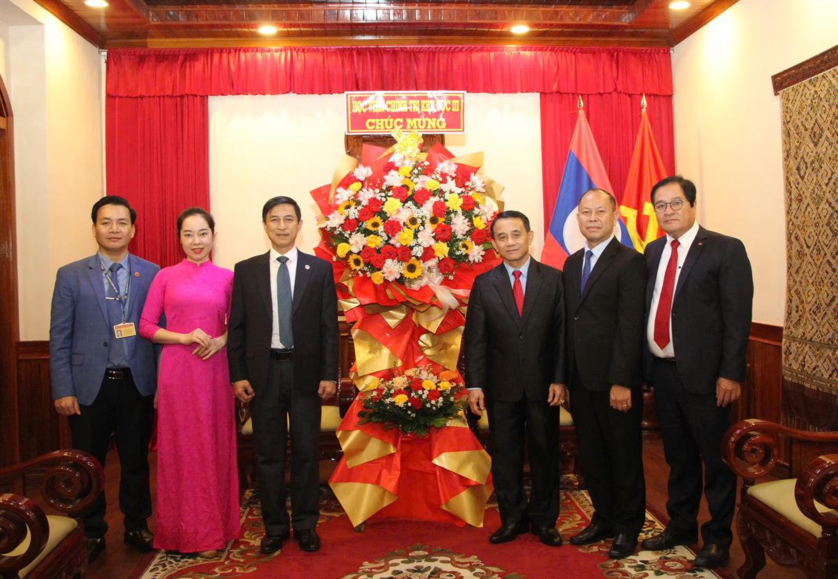 PGS,TS Đoàn Triệu Long và đoàn công tác của Học viện tặng hoa chúc mừng Tổng lãnh sự quán Lào tại Đà Nẵng nhân dịp kỷ niệm 50 năm Quốc khánh nước CHDCND Lào