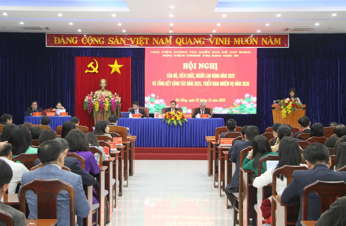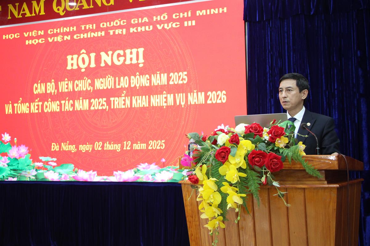 Phát biểu chỉ đạo Hội nghị, PGS,TS Dương Trung Ý ghi nhận, biểu dương và chúc mừng những thành tích mà Học viện chính trị khu vực III đã đạt được của Học viện III đã đạt được năm 2025, đồng thời yêu cầu phát huy kết quả đã đạt được và khắc phục những hạn chế, khó khăn trong năm 2026. Gắn với bối cảnh tình hình, nhiệm vụ xây dựng và phát triển Học viện trong tình hình mới, PGS,TS Dương Trung Ý đề nghị Học viện III quan tâm, thực hiện tốt một số yêu cầu nhiệm vụ: Nhận thức đúng, đầy đủ hơn nữa về vị trí, vai trò của Học viện Chính trị khu vực III; tiếp tục đổi mới, nâng cao hơn nữa chất lượng, hiệu quả công tác đào tạo, bồi dưỡng cán bộ; tiếp tục đổi mới, nâng cao chất lượng, hiệu quả công tác trên tất cả các mặt công tác; chú trọng xây dựng Học viện chuẩn, Học viện thông minh theo hướng: Chuẩn về thể chế, chuẩn về tổ chức bộ máy, chuẩn về nội dung chương trình; phương pháp đào tạo, chuẩn về đội ngũ, chuẩn về cơ sở vật chất, chuẩn về văn hóa Trường Đảng… tiến tới đẩy mạnh chuyển đổi số, triển khai mô hình Học viện thông minh: xây dựng Học viện III thông minh, văn minh, hiện đại.
