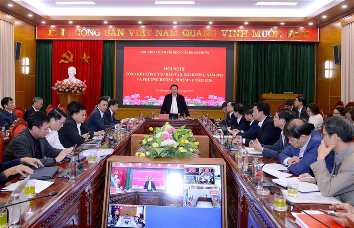 Báo cáo tại Hội nghị, TS Đậu Tuấn Nam, Vụ trưởng Vụ Quản lý đào tạo, bồi dưỡng cho biết, năm 2025, trong điều kiện sắp xếp, tổ chức bộ máy các ban, bộ ngành Trung ương và địa phương theo mô hình chính quyền hai cấp, Học viện Chính trị quốc gia Hồ Chí Minh đã nhanh chóng điều chỉnh, thích ứng với bối cảnh tổ chức sắp xếp bộ máy của hệ thống chính trị nói chung và Học viện nói riêng, duy trì hoạt động đào tạo, bồi dưỡng thông suốt, ổn định và hiệu quả.