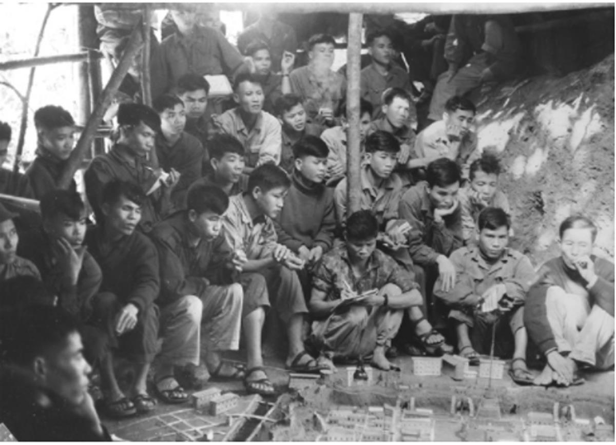 Các chiến sĩ phân đội 1 và 2 quân giải phóng Trị Thiên Huế nghiên cứu sa bàn chuẩn bị các phương án tác chiến. (Nguồn: Thanhnien.vn)