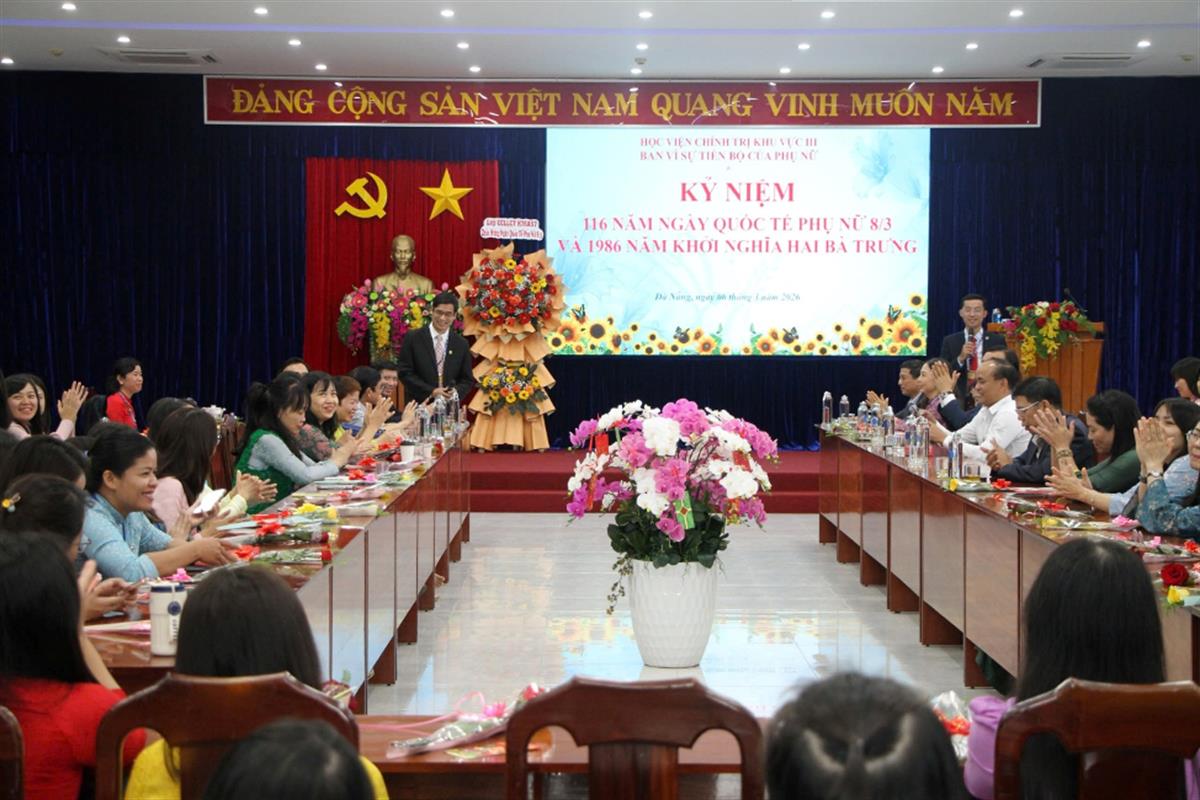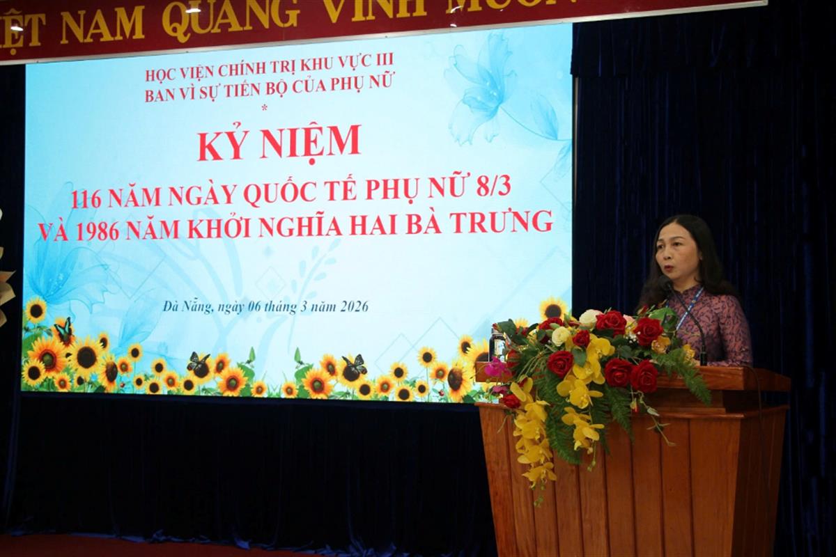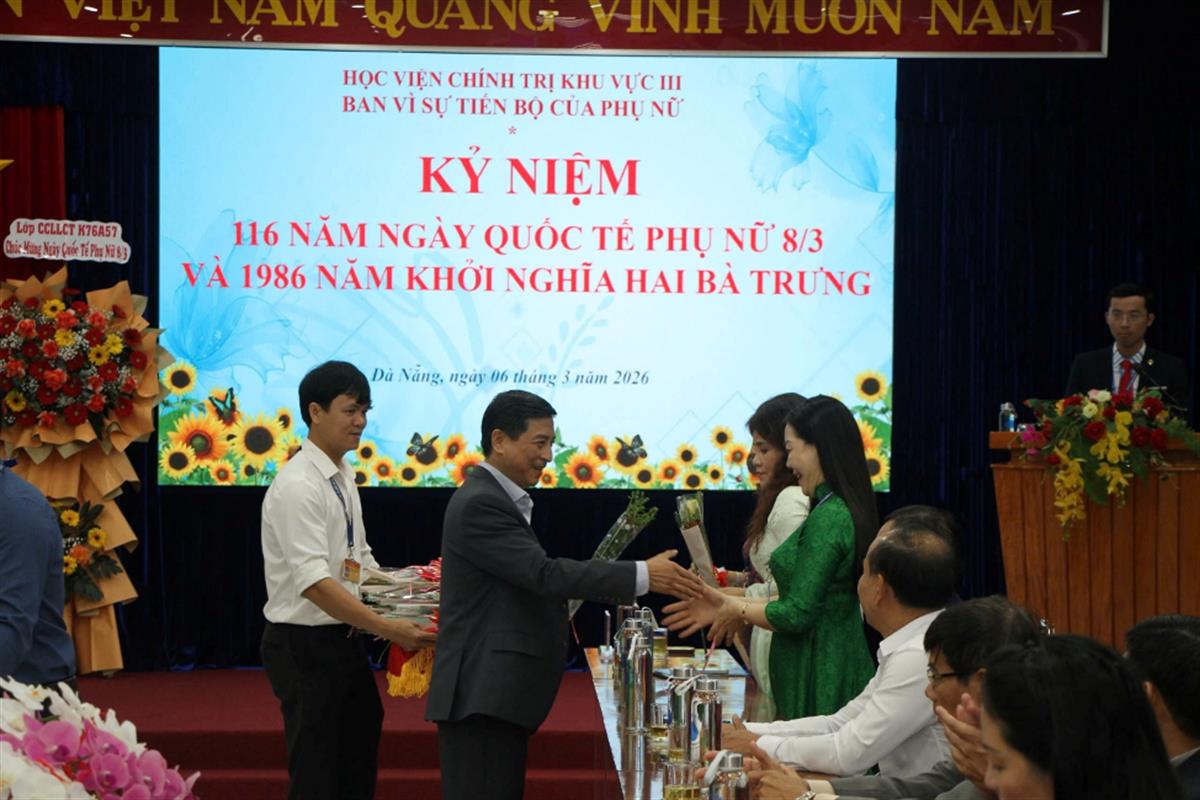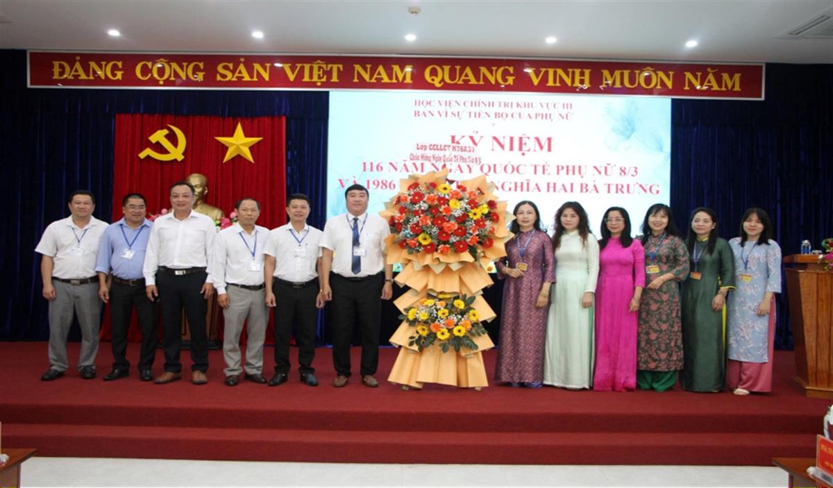 (HCMA3) - Ngày 06/3/2026, Học viện Chính trị khu vực III long trọng tổ chức Chương trình kỷ niệm 116 năm Ngày Quốc tế Phụ nữ (08/3/1910 - 08/3/2026) và 1986 năm Khởi nghĩa Hai Bà Trưng. Đây là dịp ý nghĩa để tôn vinh vẻ đẹp, trí tuệ và những đóng góp to lớn của đội ngũ nữ cán bộ, giảng viên và học viên trong sự nghiệp đào tạo, bồi dưỡng lý luận chính trị, xây dựng và phát triển Học viện.
