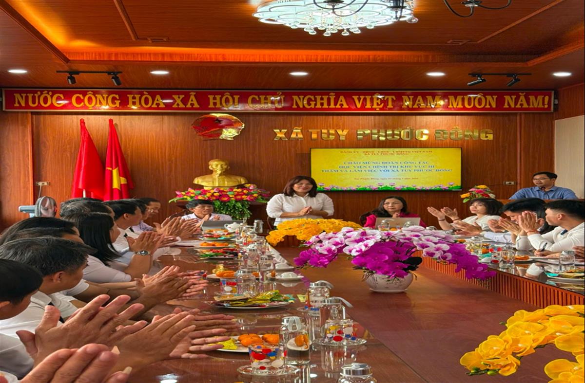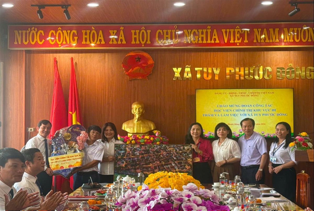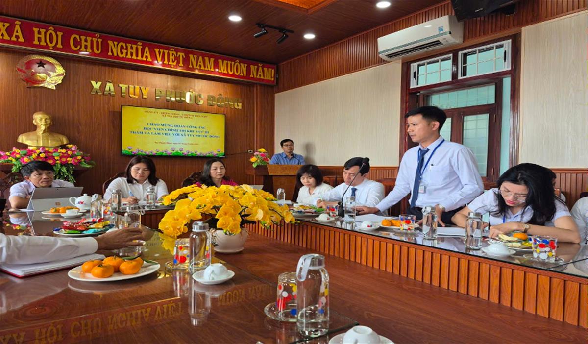 Thực hiện Quyết định số 207-QĐ/HVCTKV III ngày 05/02/2026 của Giám đốc Học viện Chính trị khu vực III, sáng ngày 03/3/2026, Đoàn nghiên cứu thực tế lớp K76A57.5 do Tiến sĩ Nguyễn Thị Linh Giang, Trưởng khoa Nhà nước và Pháp luật - Học viện Chính trị khu vực III làm Trưởng đoàn đã có buổi làm việc tại xã Tuy Phước Đông, tỉnh Gia Lai. Tiếp và làm việc với Đoàn có đồng chí Cao Hoàng Mộng Tiên - Phó Bí thư Thường trực Đảng ủy; đồng chí Huỳnh Thanh Trang - Ủy viên Ban Thường vụ, Phó Chủ tịch Thường trực Ủy ban nhân dân xã; đồng chí Nguyễn Minh Đức - Ủy viên Ban Thường vụ, Chủ nhiệm Ủy ban Kiểm tra Đảng ủy cùng đại diện lãnh đạo các bộ phận chuyên môn của xã.