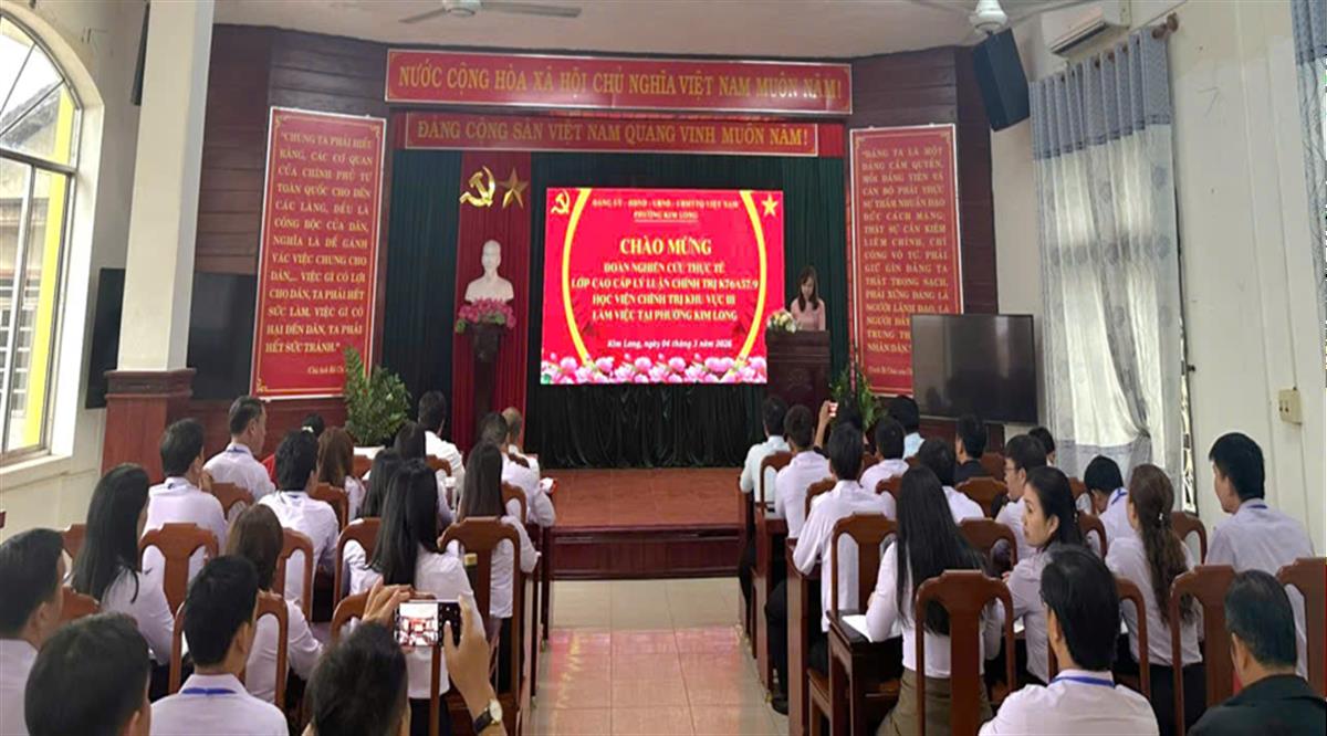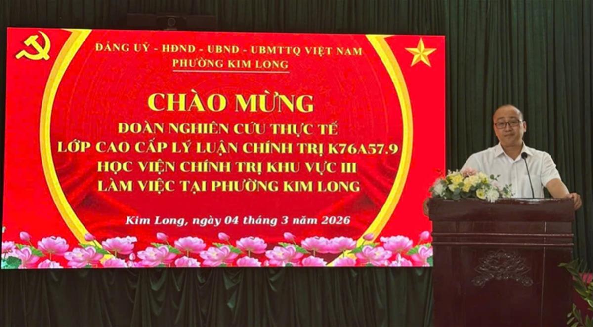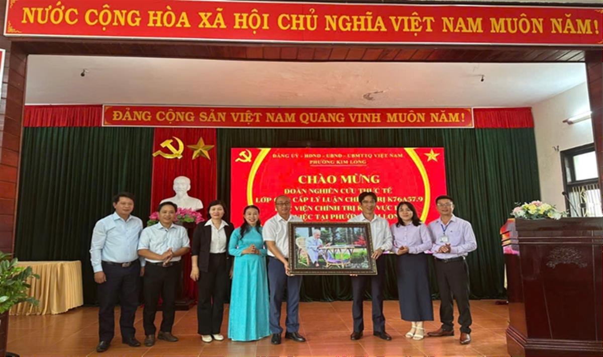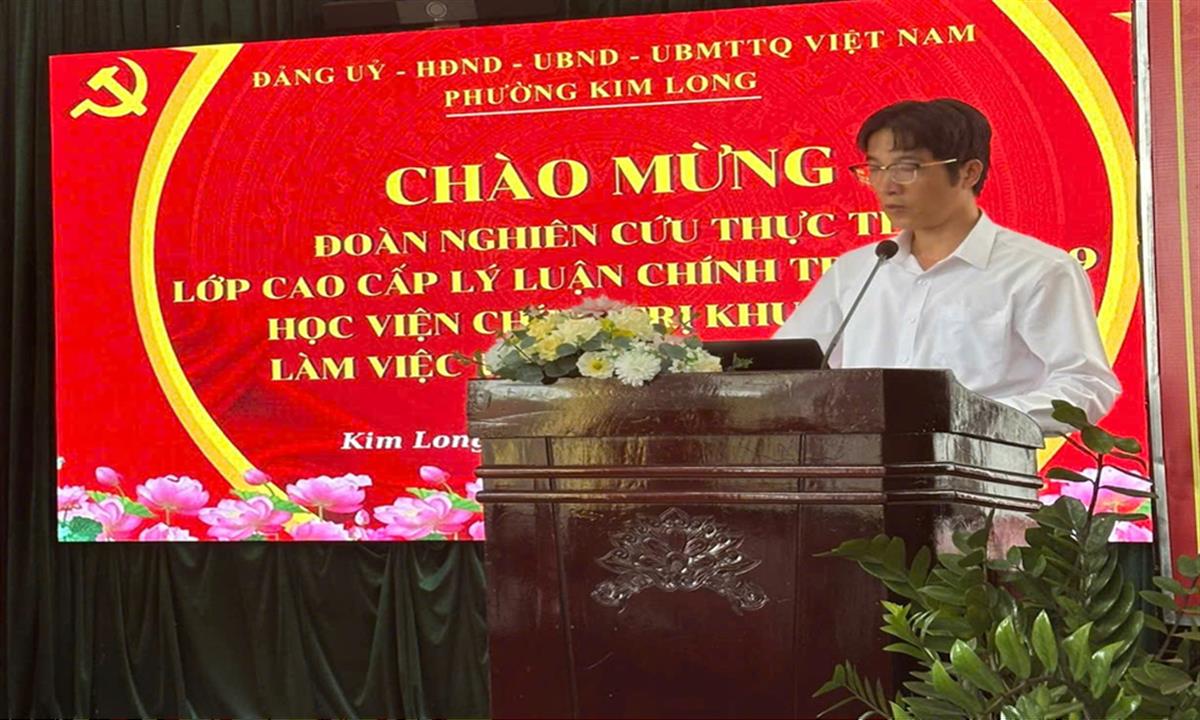 Thay mặt Đoàn, TS Trần Văn Phương - Phó Trưởng khoa Xây dựng Đảng, Học viện Chính trị khu vực III bày tỏ sự cảm ơn sâu sắc tới lãnh đạo phường Kim Long đã tạo điều kiện thuận lợi để Đoàn nghiên cứu thực tế hoàn thành tốt nhiệm vụ. Đồng chí nhấn mạnh rằng những kết quả mà Đảng bộ phường Kim Long đạt được trong thời gian qua là minh chứng cho sự năng động, linh hoạt và sáng tạo trong công tác lãnh đạo, quản lý và điều hành của địa phương. Trong bối cảnh còn nhiều khó khăn, thách thức, Đảng bộ phường đã phát huy tốt vai trò lãnh đạo, chủ động đổi mới phương thức làm việc, bám sát thực tiễn theo hướng gần dân, sát dân và vì lợi ích của Nhân dân để đề ra các giải pháp phù hợp, hiệu quả. Đặc biệt, địa phương đã chú trọng phát huy tinh thần đoàn kết, thống nhất trong toàn hệ thống chính trị, đồng thời khơi dậy trách nhiệm và sự đồng thuận của cán bộ, đảng viên và Nhân dân trong việc thực hiện các mục tiêu, nhiệm vụ chung. Đây là những kinh nghiệm thực tiễn quý báu để học viên lớp Cao cấp Lý luận chính trị K76A57.9 học tập, vận dụng vào quá trình công tác sau khi hoàn thành chương trình đào tạo.