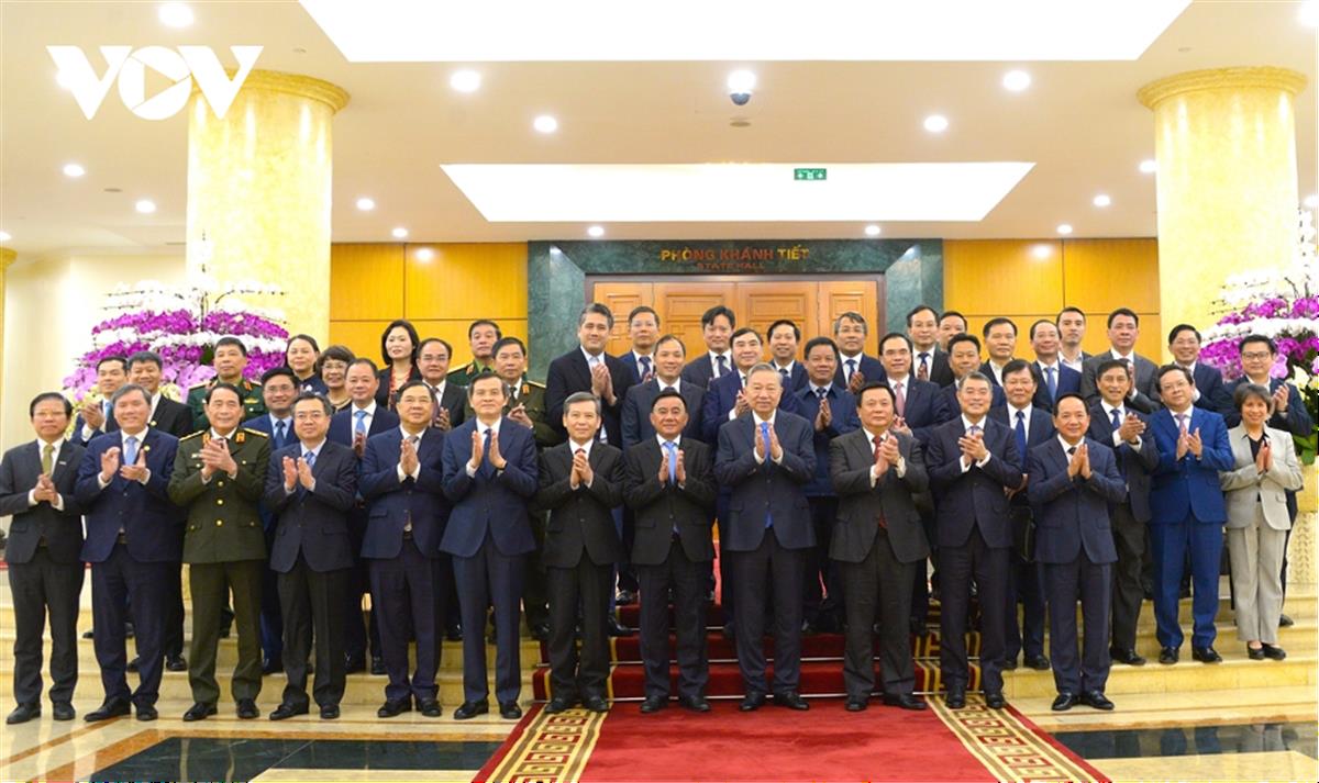 Tổng Bí thư Tô Lâm chụp ảnh lưu niệm với các thành viên Hội đồng Lý luận Trung ương.