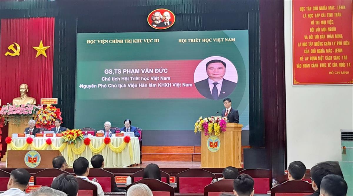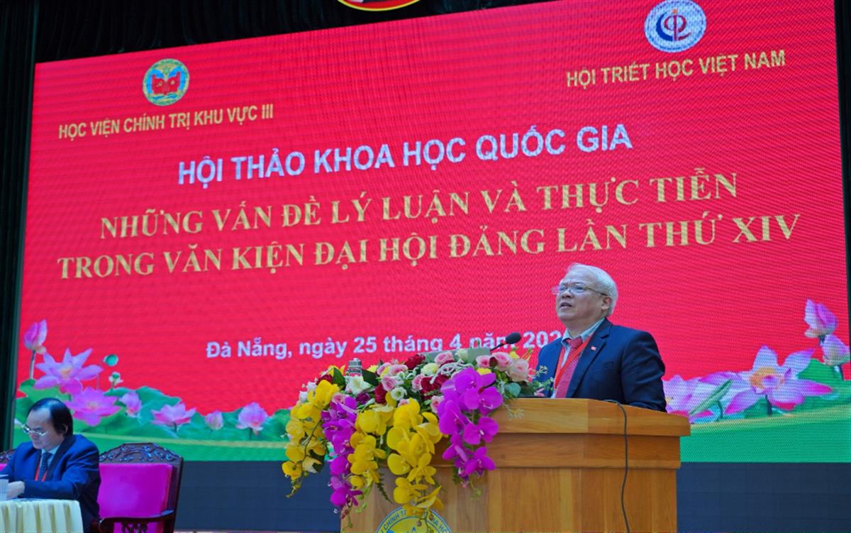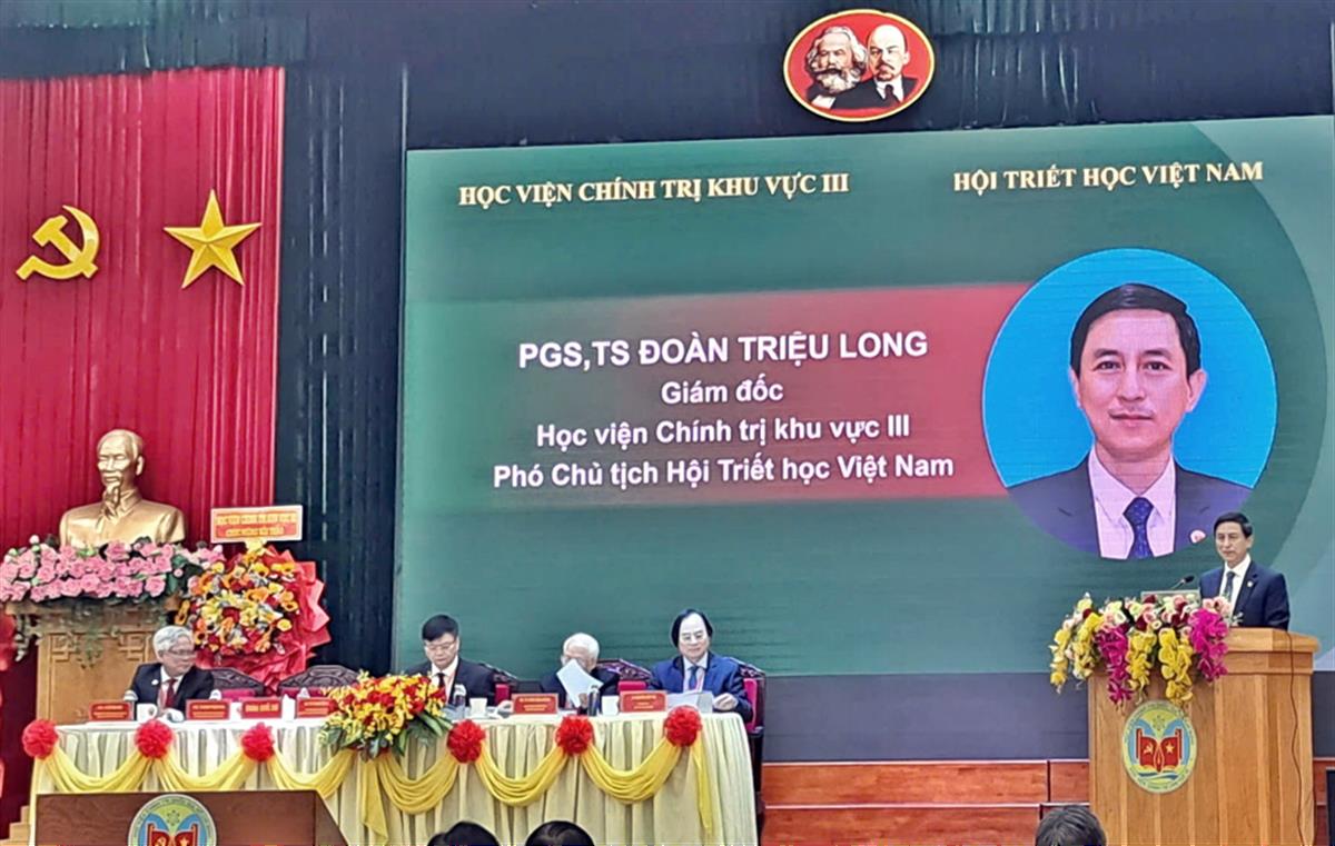 PGS, TS Đoàn Triệu Long, Bí thư Đảng ủy, Giám đốc Học viện Chính trị khu vực III, Ủy viên Hội đồng Lý luận Trung ương, Phó Chủ tịch Hội Triết học Việt Nam phát biểu chào mừng Hội thảo
