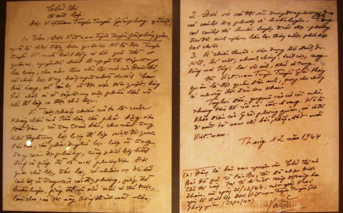1. Cuối tháng 10 năm 1944, Hồ Chí Minh từ Trung Quốc trở về Hà Quảng, Cao Bằng để trực tiếp lãnh đạo cách mạng, tiến tới tổng khởi nghĩa. Sau khi phân tích tình hình cách mạng trong nước, Người triệu tập đồng chí Võ Nguyên Giáp và Vũ Anh đến Pác Bó đẻ bàn bạc và ra Chỉ thị thành lập Đội Việt Nam tuyên truyền giải phóng quân[1]. Nội dung chỉ thị gồm ba vấn đề chủ yếu: (1) Tên Đội Việt Nam tuyên truyền giải phóng quân là chính trị trọng hơn quân sự. Nó là đội tuyên truyền. Đội có nhiệm vụ dìu dắt cán bộ vũ trang của các địa phương, giúp đỡ huấn luyện, vũ khí nếu có thể được, làm cho các đội này trưởng thành lên mãi. Nguyên tắc tổ chức lực lượng là sẽ chọn lọc trong hàng ngũ những du kích Cao - Bắc - Lạng số cán bộ và đội viên kiên quyết, hăng hái nhất và sẽ tập trung một phần lớn vũ khí để lập ra đội chủ lực. (2) Đối với các đội vũ trang địa phương: tập trung huấn luyện các cán bộ địa phương rồi đưa về huấn luyện ở các địa phương, trao đổi kinh nghiệm, liên lạc thông suốt, phối hợp tác chiến. (3) Về chiến thuật: Vận dụng lối đánh du kích, bí mật, nhanh chóng, tích cực, nay Đông mai Tây, “lai vô ảnh, khứ vô tung”, Người tin tưởng và khẳng định: “Tuy lúc đầu quy mô của nó còn nhỏ, nhưng tiền đồ của nó rất vẻ vang. Nó là khởi điểm của giải phóng quân, nó có thể đi suốt từ Nam chí Bắc, khắp đất nước Việt Nam”[2].